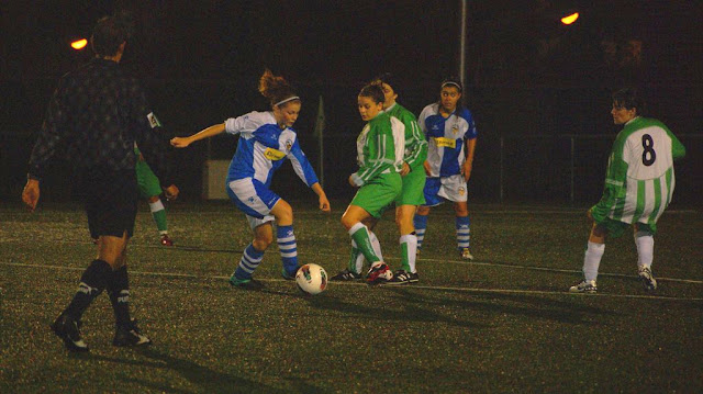 Els dos equips varen començar el partit estudiant-se, però les arlequinades tenien ganes de tornar a assaborir una victòria i varen ser les primeres en provar de marcar, amb un cop de cap de Marisol aturat per la portera visitant al quart d'hora i tres minuts desprès amb una centrada d'Aranda rematada lleugerament desviada per Cosi. Era el preludi del 1-0, al minut 20, on un embolic a dintre de l'àrea va ser sol·lucionat per Tania, que va fer la passada a Gisela que va batre a la portera rival sense oposició. El partit va entrar en una fase de centrecampisme que només va trencar Amanda, en una internada per la banda esquerra i una vaselina perfectament executada que va significar el 2-0. Fins al final de la primera part, els dos equips van patir la forta pluja i moltes imprecisions al joc.